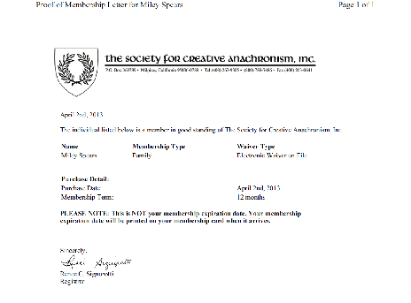 | Here's my Society for Creative Anachronism membership statement for 2013. My SCA name is Ariel Lovechild. I was a member before that. You can see proof of my registering my SCA name and device below back in 2011. http://heraldry.sca.org/loar/2011/11/11-11lar.html |